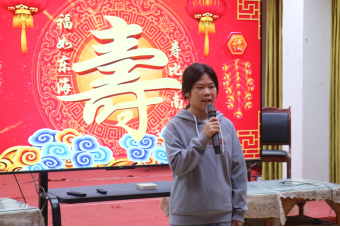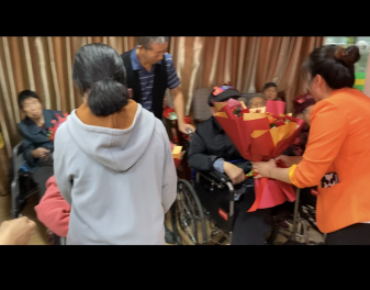 活动伊始,大屏幕上缓缓播放百岁老人的生活日常片段,画面中老人与工作人员亲切互动、悠闲生活的场景,偶尔还会对着镜头露出慈祥的笑容。这些未经修饰的生活片段,真实还原了老人在公寓的幸福日常。画面流转间,现场掌声不断,不少人拿出手机记录,生怕错过这份温暖。温情氛围中,公寓负责人黄雯雯率先上台。她握着话筒,既向老人送上“愿您笑口常开,福寿绵长”的生日祝福,也点赞老人乐观豁达的生活态度。在致辞过程中由志愿者小朋友和工作人员亲自为老人献上鲜花,传递公寓全体人员的敬意与关怀。紧接着,家属代表上台发言,言语间满含对老人的感恩与祝福,也对老年公寓的悉心照料表达了认可和感谢。