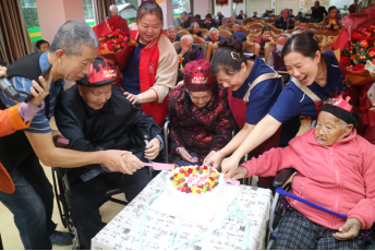 庆典的压轴环节是切蛋糕仪式。工作人员推上定制的百岁生日蛋糕,蛋糕上“寿比南山”的字样格外醒目。在全场人员齐唱生日歌的温馨氛围中,在众人的陪伴下,百岁老人亲手切下第一刀蛋糕,工作人员分发给现场所有长者一起分享生日的喜悦。最后,公寓负责人宣布本次百岁老人生日庆典活动圆满结束。